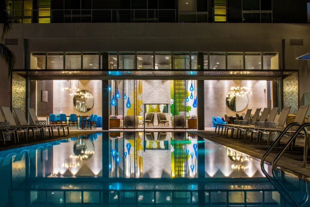 High-end living with luxury amenities and outdoor lounge areas.