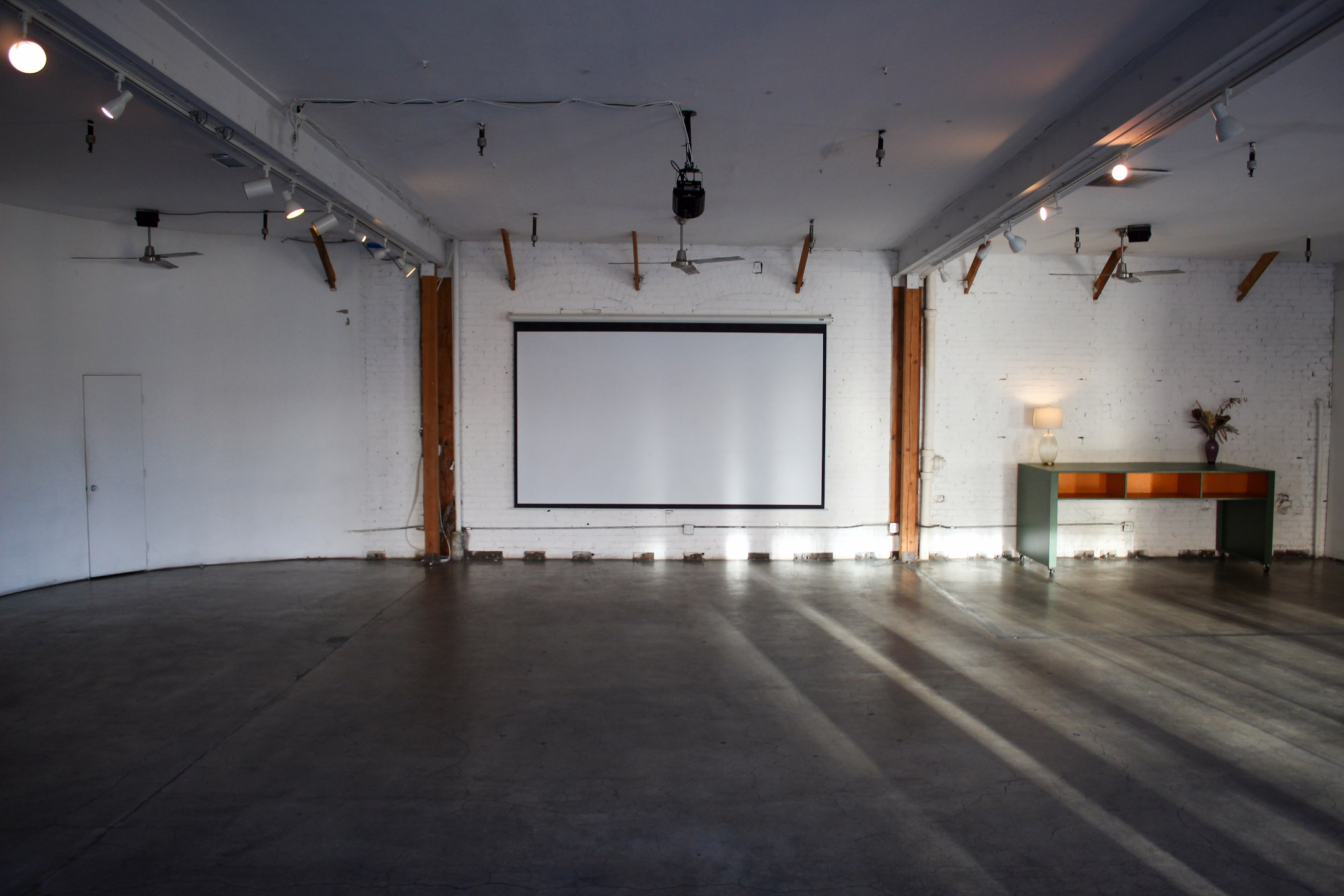 Studio B is available as an add-on: a soundproof black box with a projector and built-in sound system, perfect for podcast recordings, private screenings, rehearsals, and green room setups.